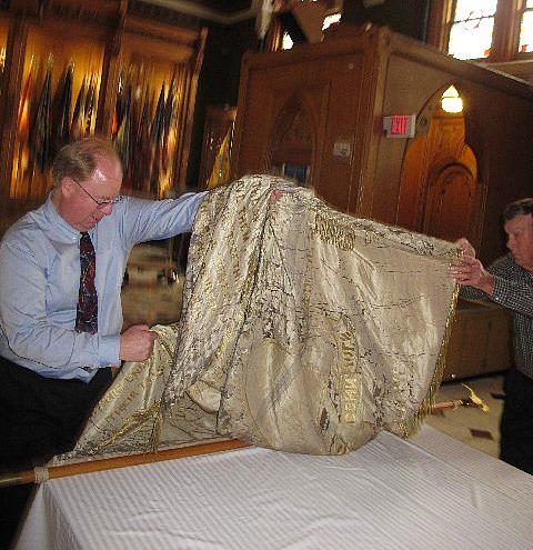 | Massachusetts antiques dealer Harold Gordon (right) examines the 16th Connecticut flag. |