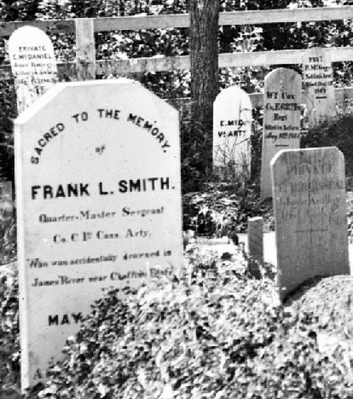 In life, they tried to kill each other. In death, Frank L. Smith of the 1st Connecticut Heavy Artillery and at least six Confederate soldiers were buried together in the same small graveyard next to a woodlot at Drewry's Bluff, near the banks of the James River, seven miles south of Richmond.